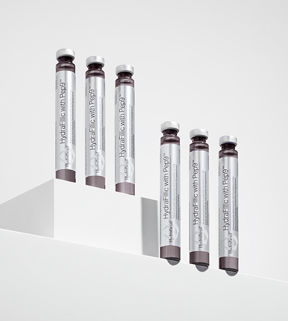 El Booster HydraFillic with Pep9 mejora la elasticidad de la piel y disminuye la apariencia de líneas de expresión y arrugas con peptidos, complejo triple de ácido hialurónico y extractos de frutas.